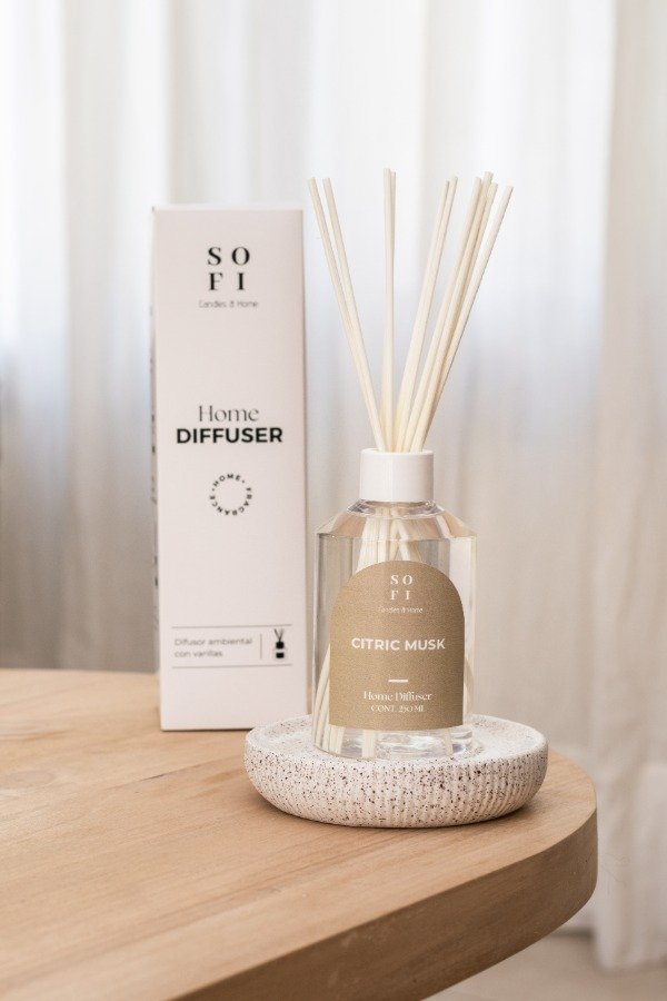 Difusor de ambiente en envase de pvc transparente con tapa blanca difusora. Incluye 8 varillas de rattan blancas